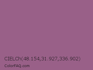 CIELCh 48.154,31.927,336.902 Color is a normal magenta color and the nearest color is Strikemaster #956387. Hex code #996088 and RGB value is rgb(153,96,136). In RGB color space, this color is composed of 60% red, 38% green, 53% blue, In CMYK color space, this color is composed of 0% cyan, 37% magenta, 11% yellow , 40% black , In HSL color space, this color has a hue angle of 318° , 23% saturation and 49% lightness.