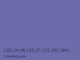 CIELCh 48.155,37.153,295.384 Color is a normal indigo color and the nearest color is Deluge #7563a8. Hex code #6d6cab and RGB value is rgb(109,108,171). In RGB color space, this color is composed of 43% red, 42% green, 67% blue, In CMYK color space, this color is composed of 36% cyan, 37% magenta, 0% yellow , 33% black , In HSL color space, this color has a hue angle of 241° , 27% saturation and 55% lightness.