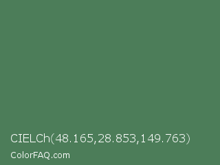CIELCh 48.165,28.853,149.763 Color is a normal green color and the nearest color is Como #517c66. Hex code #4c7d59 and RGB value is rgb(76,125,89). In RGB color space, this color is composed of 30% red, 49% green, 35% blue, In CMYK color space, this color is composed of 39% cyan, 0% magenta, 29% yellow , 51% black , In HSL color space, this color has a hue angle of 136° , 24% saturation and 39% lightness.