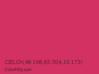 CIELCh 48.168,65.504,10.173 Color is a normal rose color and the nearest color is Cerise Red #de3163. Hex code #d33162 and RGB value is rgb(211,49,98). In RGB color space, this color is composed of 83% red, 19% green, 38% blue, In CMYK color space, this color is composed of 0% cyan, 77% magenta, 54% yellow , 17% black , In HSL color space, this color has a hue angle of 342° , 65% saturation and 51% lightness.