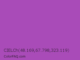 CIELCh 48.169,67.798,323.119 Color is a normal magenta color and the nearest color is Purple Plum #9c51b6. Hex code #a94bb8 and RGB value is rgb(169,75,184). In RGB color space, this color is composed of 66% red, 29% green, 72% blue, In CMYK color space, this color is composed of 8% cyan, 59% magenta, 0% yellow , 28% black , In HSL color space, this color has a hue angle of 292° , 43% saturation and 51% lightness.
