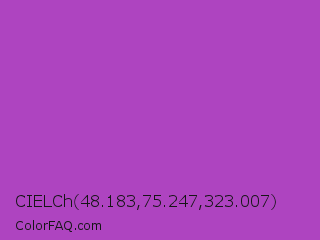 CIELCh 48.183,75.247,323.007 Color is a normal purple color and the nearest color is Purple Plum #9c51b6. Hex code #ae44c0 and RGB value is rgb(174,68,192). In RGB color space, this color is composed of 68% red, 27% green, 75% blue, In CMYK color space, this color is composed of 9% cyan, 65% magenta, 0% yellow , 25% black , In HSL color space, this color has a hue angle of 291° , 50% saturation and 51% lightness.