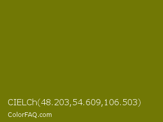 CIELCh 48.203,54.609,106.503 Color is a dark yellow color and the nearest color is Bronze Yellow #737000. Hex code #717805 and RGB value is rgb(113,120,5). In RGB color space, this color is composed of 44% red, 47% green, 2% blue, In CMYK color space, this color is composed of 6% cyan, 0% magenta, 96% yellow , 53% black , In HSL color space, this color has a hue angle of 64° , 92% saturation and 25% lightness.
