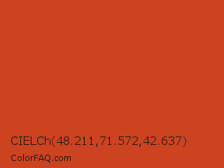 CIELCh 48.211,71.572,42.637 Color is a normal red color and the nearest color is Dark Pastel Red #c23b22. Hex code #cc4321 and RGB value is rgb(204,67,33). In RGB color space, this color is composed of 80% red, 26% green, 13% blue, In CMYK color space, this color is composed of 0% cyan, 67% magenta, 84% yellow , 20% black , In HSL color space, this color has a hue angle of 12° , 72% saturation and 46% lightness.