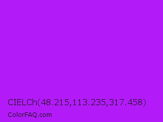 CIELCh 48.215,113.235,317.458 Color is a normal purple color and the nearest color is Veronica #a020f0. Hex code #b21bf7 and RGB value is rgb(178,27,247). In RGB color space, this color is composed of 70% red, 11% green, 97% blue, In CMYK color space, this color is composed of 28% cyan, 89% magenta, 0% yellow , 3% black , In HSL color space, this color has a hue angle of 281° , 93% saturation and 54% lightness.