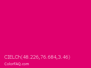 CIELCh 48.226,76.684,3.46 Color is a normal rose color and the nearest color is Red Purple #e40078. Hex code #e0006e and RGB value is rgb(224,0,110). In RGB color space, this color is composed of 88% red, 0% green, 43% blue, In CMYK color space, this color is composed of 0% cyan, 100% magenta, 51% yellow , 12% black , In HSL color space, this color has a hue angle of 331° , 100% saturation and 44% lightness.