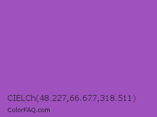 CIELCh 48.227,66.677,318.511 Color is a normal purple color and the nearest color is Deep Lilac #9955bb. Hex code #9f51be and RGB value is rgb(159,81,190). In RGB color space, this color is composed of 62% red, 32% green, 75% blue, In CMYK color space, this color is composed of 16% cyan, 57% magenta, 0% yellow , 25% black , In HSL color space, this color has a hue angle of 283° , 46% saturation and 53% lightness.
