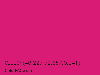 CIELCh 48.227,72.857,0.141 Color is a normal rose color and the nearest color is Vivid Cerise #da1d81. Hex code #da1b75 and RGB value is rgb(218,27,117). In RGB color space, this color is composed of 85% red, 11% green, 46% blue, In CMYK color space, this color is composed of 0% cyan, 88% magenta, 46% yellow , 15% black , In HSL color space, this color has a hue angle of 332° , 78% saturation and 48% lightness.