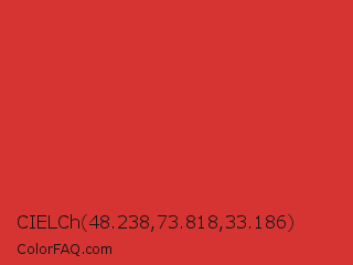 CIELCh 48.238,73.818,33.186 Color is a normal red color and the nearest color is Persian Red #cc3333. Hex code #d63432 and RGB value is rgb(214,52,50). In RGB color space, this color is composed of 84% red, 20% green, 20% blue, In CMYK color space, this color is composed of 0% cyan, 76% magenta, 77% yellow , 16% black , In HSL color space, this color has a hue angle of 1° , 67% saturation and 52% lightness.