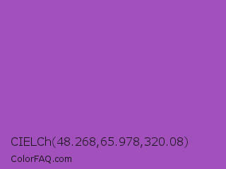 CIELCh 48.268,65.978,320.08 Color is a normal purple color and the nearest color is Purple Plum #9c51b6. Hex code #a250bb and RGB value is rgb(162,80,187). In RGB color space, this color is composed of 64% red, 31% green, 73% blue, In CMYK color space, this color is composed of 13% cyan, 57% magenta, 0% yellow , 27% black , In HSL color space, this color has a hue angle of 286° , 44% saturation and 52% lightness.