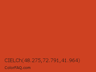 CIELCh 48.275,72.791,41.964 Color is a normal red color and the nearest color is Dark Pastel Red #c23b22. Hex code #ce4121 and RGB value is rgb(206,65,33). In RGB color space, this color is composed of 81% red, 25% green, 13% blue, In CMYK color space, this color is composed of 0% cyan, 68% magenta, 84% yellow , 19% black , In HSL color space, this color has a hue angle of 11° , 72% saturation and 47% lightness.