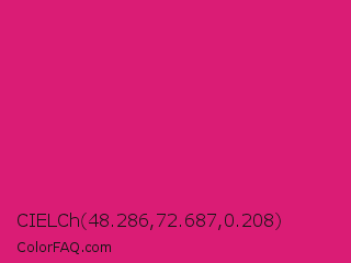 CIELCh 48.286,72.687,0.208 Color is a normal rose color and the nearest color is Vivid Cerise #da1d81. Hex code #da1c75 and RGB value is rgb(218,28,117). In RGB color space, this color is composed of 85% red, 11% green, 46% blue, In CMYK color space, this color is composed of 0% cyan, 87% magenta, 46% yellow , 15% black , In HSL color space, this color has a hue angle of 332° , 77% saturation and 48% lightness.