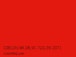CIELCh 48.28,91.722,39.207 Color is a normal red color and the nearest color is Lust #e62020. Hex code #e3180e and RGB value is rgb(227,24,14). In RGB color space, this color is composed of 89% red, 9% green, 5% blue, In CMYK color space, this color is composed of 0% cyan, 89% magenta, 94% yellow , 11% black , In HSL color space, this color has a hue angle of 3° , 88% saturation and 47% lightness.