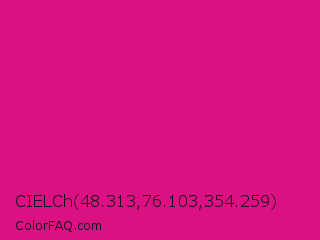 CIELCh 48.313,76.103,354.259 Color is a normal magenta color and the nearest color is Vivid Cerise #da1d81. Hex code #db1082 and RGB value is rgb(219,16,130). In RGB color space, this color is composed of 86% red, 6% green, 51% blue, In CMYK color space, this color is composed of 0% cyan, 93% magenta, 41% yellow , 14% black , In HSL color space, this color has a hue angle of 326° , 86% saturation and 46% lightness.