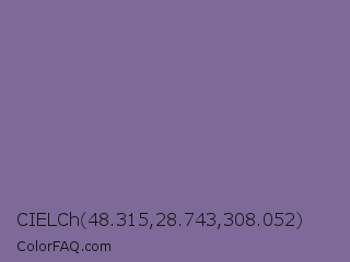 CIELCh 48.315,28.743,308.052 Color is a normal violet color and the nearest color is Kimberly #736c9f. Hex code #7e6a99 and RGB value is rgb(126,106,153). In RGB color space, this color is composed of 49% red, 42% green, 60% blue, In CMYK color space, this color is composed of 18% cyan, 31% magenta, 0% yellow , 40% black , In HSL color space, this color has a hue angle of 266° , 19% saturation and 51% lightness.