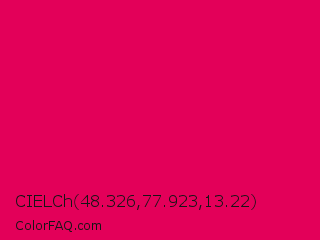 CIELCh 48.326,77.923,13.22 Color is a normal rose color and the nearest color is Razzmatazz Crayola #e30b5c. Hex code #e30059 and RGB value is rgb(227,0,89). In RGB color space, this color is composed of 89% red, 0% green, 35% blue, In CMYK color space, this color is composed of 0% cyan, 100% magenta, 61% yellow , 11% black , In HSL color space, this color has a hue angle of 336° , 100% saturation and 45% lightness.