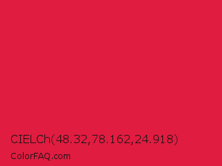 CIELCh 48.32,78.162,24.918 Color is a normal red color and the nearest color is Crimson #dc143c. Hex code #e01c40 and RGB value is rgb(224,28,64). In RGB color space, this color is composed of 88% red, 11% green, 25% blue, In CMYK color space, this color is composed of 0% cyan, 88% magenta, 71% yellow , 12% black , In HSL color space, this color has a hue angle of 349° , 78% saturation and 49% lightness.