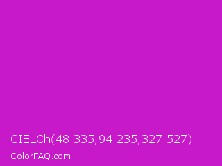 CIELCh 48.335,94.235,327.527 Color is a normal magenta color and the nearest color is Deep Magenta #cc00cc. Hex code #c718ca and RGB value is rgb(199,24,202). In RGB color space, this color is composed of 78% red, 9% green, 79% blue, In CMYK color space, this color is composed of 1% cyan, 88% magenta, 0% yellow , 21% black , In HSL color space, this color has a hue angle of 299° , 79% saturation and 44% lightness.