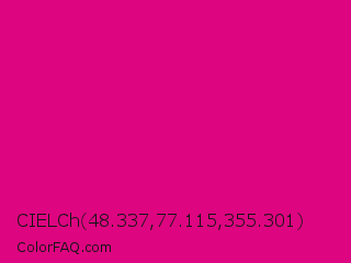 CIELCh 48.337,77.115,355.301 Color is a normal magenta color and the nearest color is Mexican Pink #e4007c. Hex code #dd0680 and RGB value is rgb(221,6,128). In RGB color space, this color is composed of 87% red, 2% green, 50% blue, In CMYK color space, this color is composed of 0% cyan, 97% magenta, 42% yellow , 13% black , In HSL color space, this color has a hue angle of 326° , 95% saturation and 45% lightness.