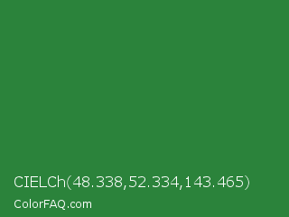 CIELCh 48.338,52.334,143.465 Color is a normal green color and the nearest color is Forest Green #228b22. Hex code #2b833b and RGB value is rgb(43,131,59). In RGB color space, this color is composed of 17% red, 51% green, 23% blue, In CMYK color space, this color is composed of 67% cyan, 0% magenta, 55% yellow , 49% black , In HSL color space, this color has a hue angle of 131° , 51% saturation and 34% lightness.