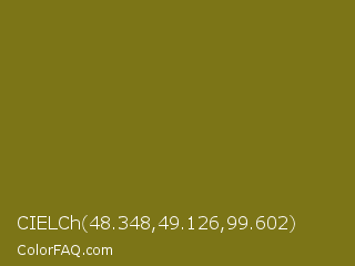 CIELCh 48.348,49.126,99.602 Color is a dark yellow color and the nearest color is Olivetone #716e10. Hex code #7c7517 and RGB value is rgb(124,117,23). In RGB color space, this color is composed of 49% red, 46% green, 9% blue, In CMYK color space, this color is composed of 0% cyan, 6% magenta, 81% yellow , 51% black , In HSL color space, this color has a hue angle of 56° , 69% saturation and 29% lightness.