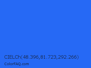 CIELCh 48.396,81.723,292.266 Color is a normal blue color and the nearest color is Blue Crayola #1f75fe. Hex code #2669f5 and RGB value is rgb(38,105,245). In RGB color space, this color is composed of 15% red, 41% green, 96% blue, In CMYK color space, this color is composed of 84% cyan, 57% magenta, 0% yellow , 4% black , In HSL color space, this color has a hue angle of 221° , 91% saturation and 55% lightness.