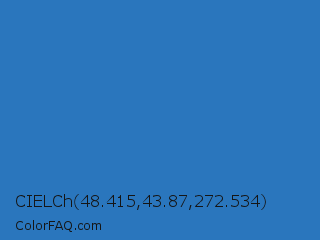 CIELCh 48.415,43.87,272.534 Color is a normal blue color and the nearest color is Mariner #286acd. Hex code #2a76bd and RGB value is rgb(42,118,189). In RGB color space, this color is composed of 16% red, 46% green, 74% blue, In CMYK color space, this color is composed of 78% cyan, 38% magenta, 0% yellow , 26% black , In HSL color space, this color has a hue angle of 209° , 64% saturation and 45% lightness.