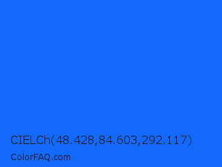 CIELCh 48.428,84.603,292.117 Color is a normal blue color and the nearest color is Blue Crayola #1f75fe. Hex code #1269fa and RGB value is rgb(18,105,250). In RGB color space, this color is composed of 7% red, 41% green, 98% blue, In CMYK color space, this color is composed of 93% cyan, 58% magenta, 0% yellow , 2% black , In HSL color space, this color has a hue angle of 218° , 96% saturation and 53% lightness.