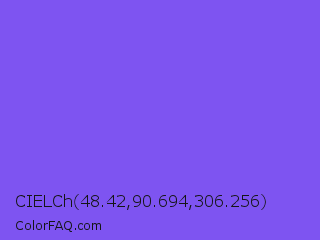 CIELCh 48.42,90.694,306.256 Color is a light indigo color and the nearest color is Medium Slate Blue #7b68ee. Hex code #7e54f1 and RGB value is rgb(126,84,241). In RGB color space, this color is composed of 49% red, 33% green, 95% blue, In CMYK color space, this color is composed of 48% cyan, 65% magenta, 0% yellow , 5% black , In HSL color space, this color has a hue angle of 256° , 85% saturation and 64% lightness.