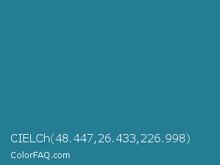 CIELCh 48.447,26.433,226.998 Color is a normal cyan color and the nearest color is Jelly Bean #297b9a. Hex code #247d93 and RGB value is rgb(36,125,147). In RGB color space, this color is composed of 14% red, 49% green, 58% blue, In CMYK color space, this color is composed of 76% cyan, 15% magenta, 0% yellow , 42% black , In HSL color space, this color has a hue angle of 192° , 61% saturation and 36% lightness.