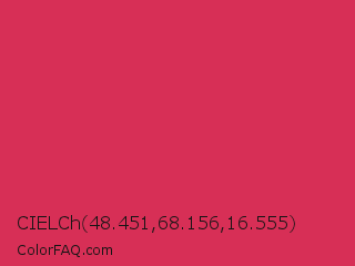 CIELCh 48.451,68.156,16.555 Color is a normal red color and the nearest color is Cerise Red #de3163. Hex code #d72f56 and RGB value is rgb(215,47,86). In RGB color space, this color is composed of 84% red, 18% green, 34% blue, In CMYK color space, this color is composed of 0% cyan, 78% magenta, 60% yellow , 16% black , In HSL color space, this color has a hue angle of 346° , 68% saturation and 51% lightness.