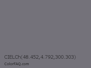 CIELCh 48.452,4.792,300.303 Color is a normal indigo color and the nearest color is Sonic Silver #757575. Hex code #74727a and RGB value is rgb(116,114,122). In RGB color space, this color is composed of 45% red, 45% green, 48% blue, In CMYK color space, this color is composed of 5% cyan, 7% magenta, 0% yellow , 52% black , In HSL color space, this color has a hue angle of 255° , 3% saturation and 46% lightness.