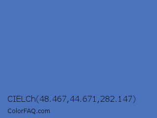 CIELCh 48.467,44.671,282.147 Color is a normal blue color and the nearest color is Indigo #4f69c6. Hex code #4a72bd and RGB value is rgb(74,114,189). In RGB color space, this color is composed of 29% red, 45% green, 74% blue, In CMYK color space, this color is composed of 61% cyan, 40% magenta, 0% yellow , 26% black , In HSL color space, this color has a hue angle of 219° , 47% saturation and 52% lightness.
