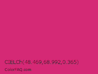 CIELCh 48.469,68.992,0.365 Color is a normal rose color and the nearest color is Telemagenta #cf3476. Hex code #d62975 and RGB value is rgb(214,41,117). In RGB color space, this color is composed of 84% red, 16% green, 46% blue, In CMYK color space, this color is composed of 0% cyan, 81% magenta, 45% yellow , 16% black , In HSL color space, this color has a hue angle of 334° , 68% saturation and 50% lightness.