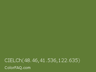 CIELCh 48.46,41.536,122.635 Color is a normal green color and the nearest color is Maximum Green #5e8c31. Hex code #607c35 and RGB value is rgb(96,124,53). In RGB color space, this color is composed of 38% red, 49% green, 21% blue, In CMYK color space, this color is composed of 23% cyan, 0% magenta, 57% yellow , 51% black , In HSL color space, this color has a hue angle of 84° , 40% saturation and 35% lightness.