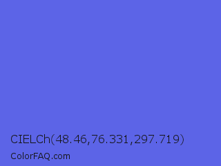 CIELCh 48.46,76.331,297.719 Color is a light blue color and the nearest color is Majorelle Blue #6050dc. Hex code #5c64e7 and RGB value is rgb(92,100,231). In RGB color space, this color is composed of 36% red, 39% green, 91% blue, In CMYK color space, this color is composed of 60% cyan, 57% magenta, 0% yellow , 9% black , In HSL color space, this color has a hue angle of 237° , 74% saturation and 63% lightness.