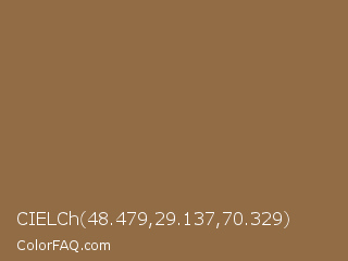 CIELCh 48.479,29.137,70.329 Color is a normal orange color and the nearest color is French Bistre #856d4d. Hex code #916c45 and RGB value is rgb(145,108,69). In RGB color space, this color is composed of 57% red, 42% green, 27% blue, In CMYK color space, this color is composed of 0% cyan, 26% magenta, 52% yellow , 43% black , In HSL color space, this color has a hue angle of 31° , 36% saturation and 42% lightness.