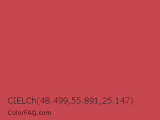 CIELCh 48.499,55.891,25.147 Color is a normal red color and the nearest color is English Vermillion #cc474b. Hex code #c6484e and RGB value is rgb(198,72,78). In RGB color space, this color is composed of 78% red, 28% green, 31% blue, In CMYK color space, this color is composed of 0% cyan, 64% magenta, 61% yellow , 22% black , In HSL color space, this color has a hue angle of 357° , 53% saturation and 53% lightness.