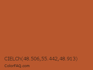 CIELCh 48.506,55.442,48.913 Color is a normal orange color and the nearest color is Tuscany #bd5e2e. Hex code #b8572d and RGB value is rgb(184,87,45). In RGB color space, this color is composed of 72% red, 34% green, 18% blue, In CMYK color space, this color is composed of 0% cyan, 53% magenta, 76% yellow , 28% black , In HSL color space, this color has a hue angle of 18° , 61% saturation and 45% lightness.