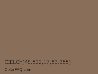 CIELCh 48.522,17,63.365 Color is a normal orange color and the nearest color is Beaver Crayola #926f5b. Hex code #896e5a and RGB value is rgb(137,110,90). In RGB color space, this color is composed of 54% red, 43% green, 35% blue, In CMYK color space, this color is composed of 0% cyan, 20% magenta, 34% yellow , 46% black , In HSL color space, this color has a hue angle of 26° , 21% saturation and 45% lightness.