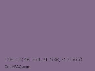 CIELCh 48.554,21.538,317.565 Color is a normal purple color and the nearest color is Rum #796989. Hex code #836b8c and RGB value is rgb(131,107,140). In RGB color space, this color is composed of 51% red, 42% green, 55% blue, In CMYK color space, this color is composed of 6% cyan, 24% magenta, 0% yellow , 45% black , In HSL color space, this color has a hue angle of 284° , 13% saturation and 48% lightness.