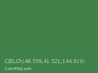 CIELCh 48.559,41.521,144.619 Color is a normal green color and the nearest color is Goblin #3d7d52. Hex code #3f8149 and RGB value is rgb(63,129,73). In RGB color space, this color is composed of 25% red, 51% green, 29% blue, In CMYK color space, this color is composed of 51% cyan, 0% magenta, 43% yellow , 49% black , In HSL color space, this color has a hue angle of 129° , 34% saturation and 38% lightness.