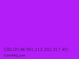 CIELCh 48.561,113.202,317.45 Color is a normal purple color and the nearest color is Veronica #a020f0. Hex code #b31df8 and RGB value is rgb(179,29,248). In RGB color space, this color is composed of 70% red, 11% green, 97% blue, In CMYK color space, this color is composed of 28% cyan, 88% magenta, 0% yellow , 3% black , In HSL color space, this color has a hue angle of 281° , 94% saturation and 54% lightness.