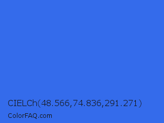 CIELCh 48.566,74.836,291.271 Color is a normal blue color and the nearest color is Royal Blue #4169e1. Hex code #346beb and RGB value is rgb(52,107,235). In RGB color space, this color is composed of 20% red, 42% green, 92% blue, In CMYK color space, this color is composed of 78% cyan, 54% magenta, 0% yellow , 8% black , In HSL color space, this color has a hue angle of 222° , 82% saturation and 56% lightness.