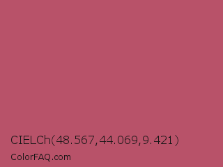 CIELCh 48.567,44.069,9.421 Color is a normal red color and the nearest color is Popstar #be4f62. Hex code #b85269 and RGB value is rgb(184,82,105). In RGB color space, this color is composed of 72% red, 32% green, 41% blue, In CMYK color space, this color is composed of 0% cyan, 55% magenta, 43% yellow , 28% black , In HSL color space, this color has a hue angle of 346° , 42% saturation and 52% lightness.