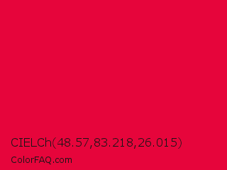CIELCh 48.57,83.218,26.015 Color is a normal red color and the nearest color is Red Ribbon #ed0a3f. Hex code #e6053b and RGB value is rgb(230,5,59). In RGB color space, this color is composed of 90% red, 2% green, 23% blue, In CMYK color space, this color is composed of 0% cyan, 98% magenta, 74% yellow , 10% black , In HSL color space, this color has a hue angle of 346° , 96% saturation and 46% lightness.