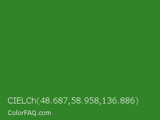 CIELCh 48.687,58.958,136.886 Color is a normal green color and the nearest color is Forest Green #228b22. Hex code #328429 and RGB value is rgb(50,132,41). In RGB color space, this color is composed of 20% red, 52% green, 16% blue, In CMYK color space, this color is composed of 62% cyan, 0% magenta, 69% yellow , 48% black , In HSL color space, this color has a hue angle of 114° , 53% saturation and 34% lightness.