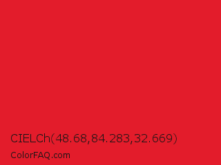 CIELCh 48.68,84.283,32.669 Color is a normal red color and the nearest color is Lust #e62020. Hex code #e31c2b and RGB value is rgb(227,28,43). In RGB color space, this color is composed of 89% red, 11% green, 17% blue, In CMYK color space, this color is composed of 0% cyan, 88% magenta, 81% yellow , 11% black , In HSL color space, this color has a hue angle of 355° , 78% saturation and 50% lightness.