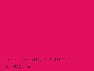 CIELCh 48.704,76.1,10.591 Color is a normal rose color and the nearest color is Ruby #e0115f. Hex code #e20f60 and RGB value is rgb(226,15,96). In RGB color space, this color is composed of 89% red, 6% green, 38% blue, In CMYK color space, this color is composed of 0% cyan, 93% magenta, 58% yellow , 11% black , In HSL color space, this color has a hue angle of 337° , 88% saturation and 47% lightness.