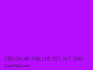 CIELCh 48.708,118.357,317.336 Color is a normal purple color and the nearest color is Electric Purple #bf00ff. Hex code #b50eff and RGB value is rgb(181,14,255). In RGB color space, this color is composed of 71% red, 5% green, 100% blue, In CMYK color space, this color is composed of 29% cyan, 95% magenta, 0% yellow , 0% black , In HSL color space, this color has a hue angle of 282° , 100% saturation and 53% lightness.
